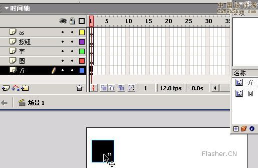 锁定和隐藏按钮,可能很多人不怎么用,其实很有用处的。当你把元件拖进相应的图层后,在“方”图层进行操作时,有可能会点中元件“圆”,此时你会发现,图层“圆”变深颜色